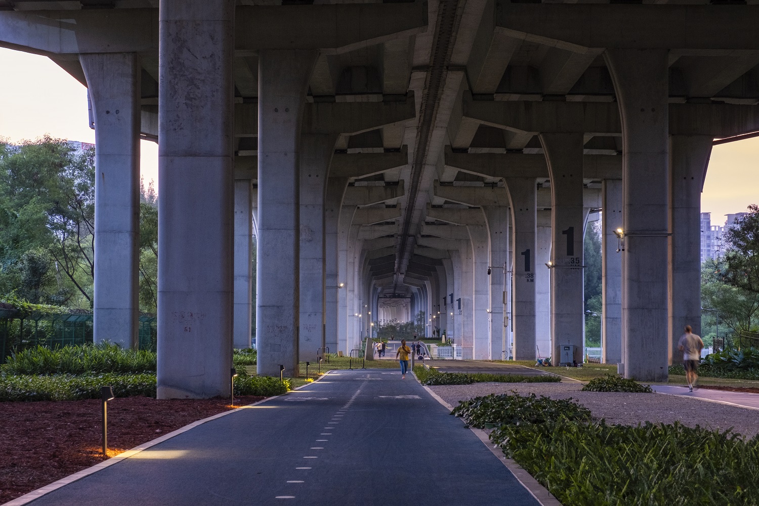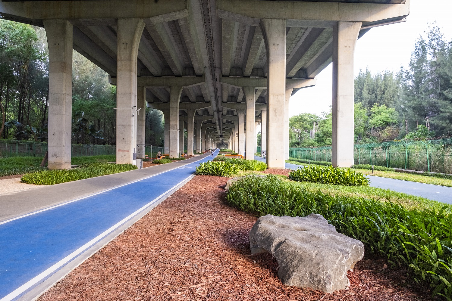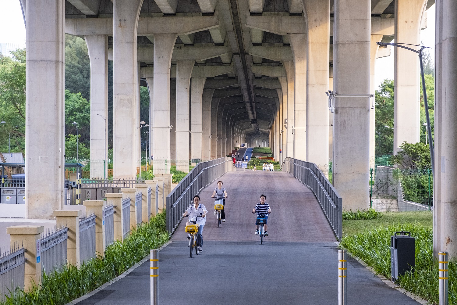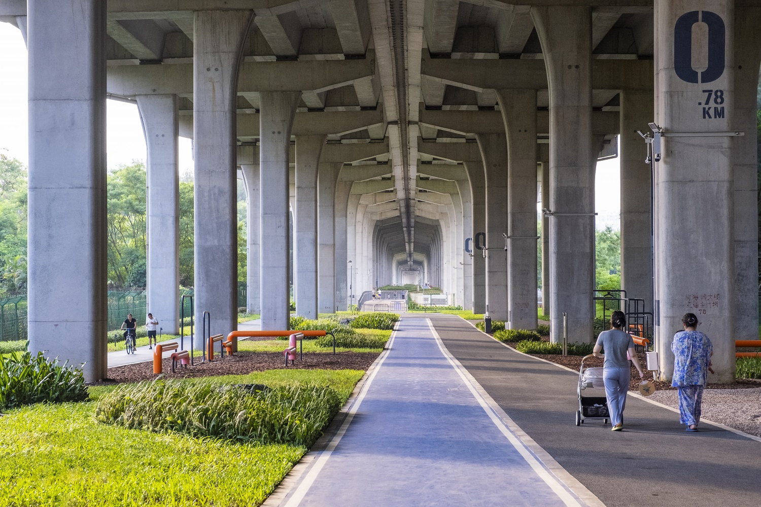 本項目北接金灣大道,南止歡樂港灣,全線位于廣深沿江高速橋下,全長6km,景觀建設(shè)面積37萬㎡,主要建設(shè)內(nèi)容包括人行道、慢跑道、自行車道、配套設(shè)施、環(huán)境提升等,是前海擴區(qū)后落實深圳市“山海連城計劃”的重要舉措。作為一個全齡友好的綜合性“多元橋下空間”,西灣-前海灣慢行道設(shè)置了騎行道、人行道、跑步道三種道路,提供了科普教育、兒童游樂、運動健身等豐富的休閑場所,有效拓展了城市的發(fā)展空間,更成為市民共享美好生活的“民生紐帶”。